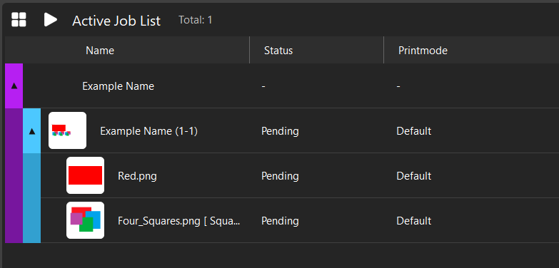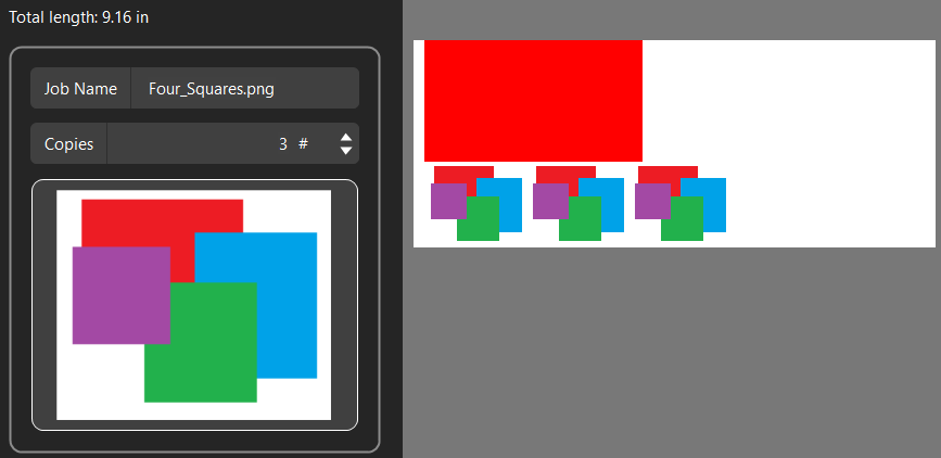 By selecting an individual job from the job list, the job name, number of copies, and individual preview will populate a job details section in the Gang Sheet Builder. Use these fields to rename the job or update the number of copies as seen fit. The gang sheet page preview will live update with the number of copies to reflect job placement on the page. Material usage information is displayed above the job preview. This shows either the total length of the gang sheet, or the number of pages used, depending on your device media settings.