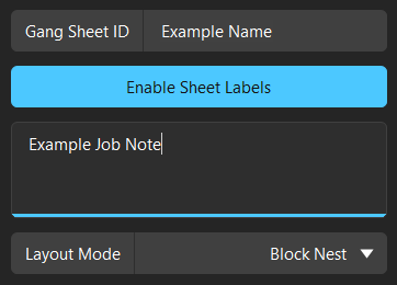 Name the gang sheet using the Gang Sheet ID field. Toggle sheet labels to your preference by using the Enable Sheet Labels button. Sheet labels include the gang sheet name, page number, date and time, the printmode used, and size of the sheet. Custom notes can be added using the Custom Notes field. Custom notes are displayed in the sheet labels if applied.