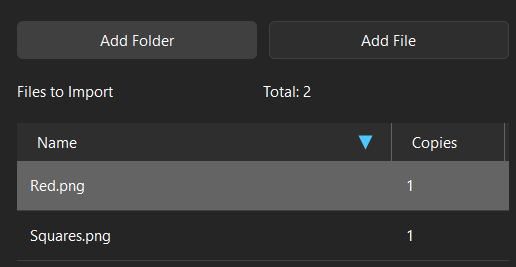 Use the Add File button to open the file explorer and select files to load into the Gang Sheet Builder. The Add Folder button can be used to import an entire folder rather than manually selecting files. Any imported files are displayed in the file list, along with their current number of copies. Files can be sorted in either ascending or descending order based on name or copies by clicking on their respective header.
