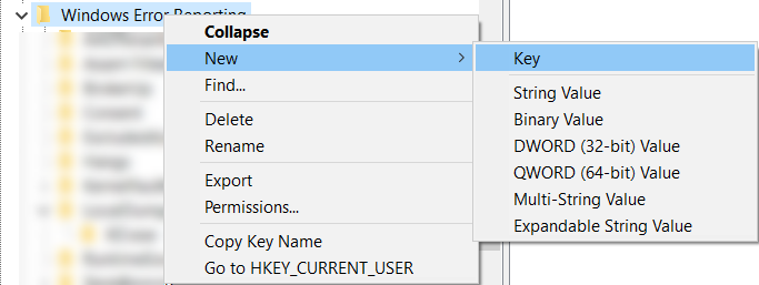 HKEY_LOCAL_MACHINE\SOFTWARE\Microsoft\Windows\Windows Error Reporting - Right-click the folder Windows Error Reporting and select New > Key.