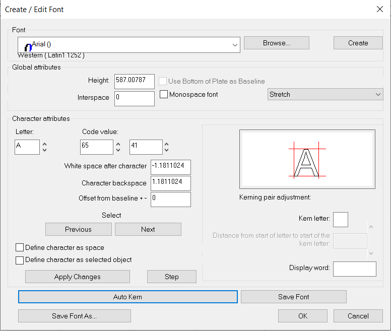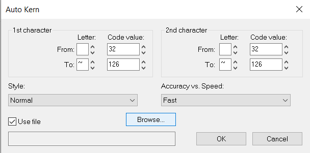 In the Create / Edit Font window, select the font auto-kern should apply to, and click the Auto-Kern button. In the Auto-Kern window, toggle on the “Use File” checkbox. Click the browse button, navigate to the created text file, and select OK. Lastly, click OK in the Auto-Kern window to finalize.