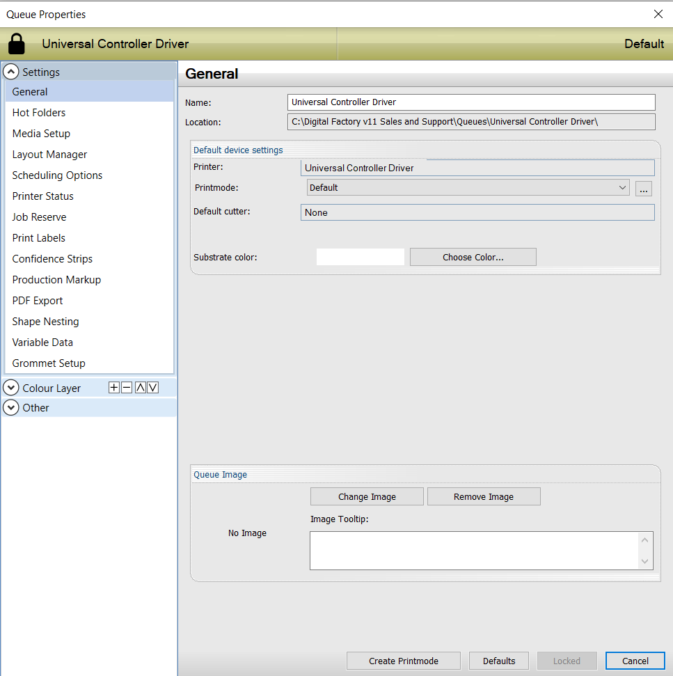 The Lock Queue Configuration option prevents users from modifying non-job-related settings which could affect output. This includes Print Mode Settings and Queue Properties. This option is ideal for keeping multiple workstations consistent once the settings have been appropriately set across them, or if multiple users are on the same workstation, preventing any accidental changes.