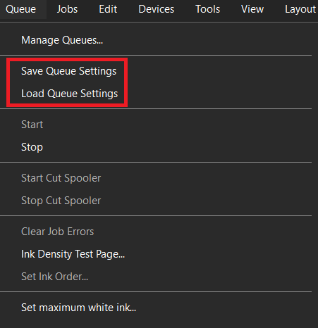 In addition to the ability to lock the print configuration, the feature is also supported by the ability to save and load existing queue settings. Once the queue has been configured as desired, navigate to Queue > Save Queue Settings. Name the file as desired and choose the save location. This file can serve as a backup in the event settings are unlocked and changed in the future.
