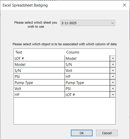 Once each item is highlighted, ensure the Replacement data file checkbox is toggled on, and find the desired spreadsheet data file using the browse button (it may be required to change the default display to show more than just .txt files). When the spreadsheet data file has been selected, the Excel Spreadsheet Badging window will populate the screen.